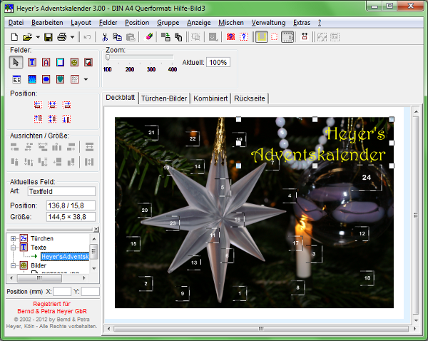 Die Verwaltung der "Türchen", deren Schnittmarken und den "dahinterliegenden" Bildchen wird von Heyer´s Adventskalender mit einem speziellen Feld-Typ automatisch verwaltet. Die Software druckt sowohl das Deckblatt wie das Blatt mit den "Türchen-Bildern". Ein klein wenig Bastelei verbleibt noch durch das Ausschneiden der Türchen und das Zusammenkleben von Deckblatt und Blatt mit den Türchenbildern. Und im Handumdrehen ist der individuelle Adventskalender fertig.