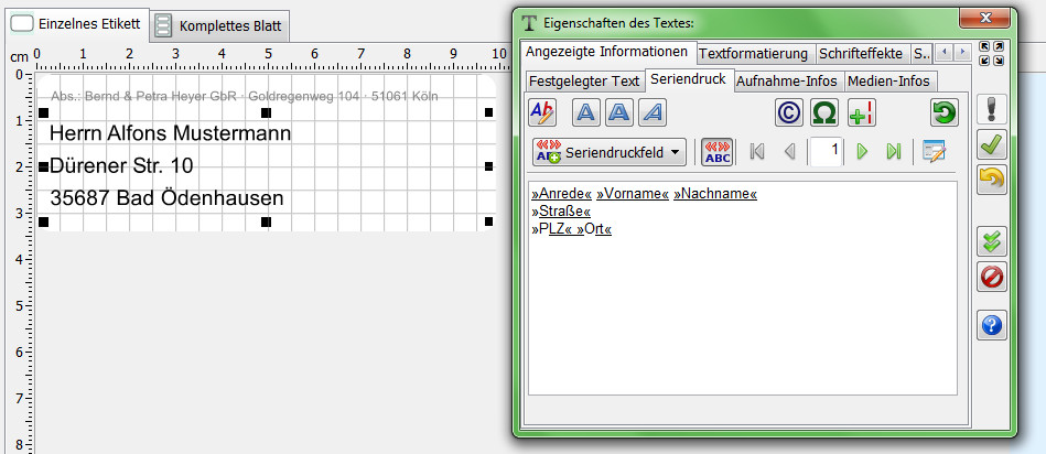 Anstelle eines statischen Textes können auch Seriendruck-Felder eingefügt werden, die dann z.B. beim Druck von Adress-Etiketten durch die entsprechenden Werte ersetzt werden.
