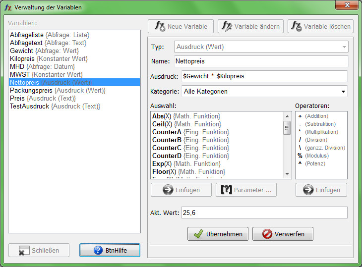Für jede Tüte bzw. Etikett das Layout zu ändern wäre viel zu viel Aufwand. Hier kommen nun die Variablen ins Spiel. Der Verkaufspreis ist die Einwaage mal Kilopreis. Dafür gibt es den Variablentyp Ausdruck (Wert). Mit diesem können normale mathematische Ausdrücke berechnet werden. Der Zugriff auf eine Variable erfolgt über den Namen der Variablen dem ein "$" vorangestellt ist, also: $Gewicht * $Kilopreis. Die Variable Kilopreis ist eine Variable mit einem konstanten Wert, da sich der Kilopreis nicht laufend ändert. Man könnte diesen natürlich auch direkt in dem Ausdruck angeben, aber der Kilopreis soll ebenfalls auf dem Etikett stehen. Bei einer Preisänderung müsste man also an mindesten zwei Stellen der Kilopreis geändert werden. Da ist es einfacher wenn dieser nur an einer Stelle bei der Variablen Kilopreis geändert wird.