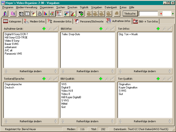 Auf dieser Registerkarte werden alle Vorgaben verwaltet, die sich auf die Aufnahmen beziehen. Hier können neue Vorgaben hinzugefügt, falsche Bezeichnungen korrigiert und nicht mehr benötigte Vorgaben gelöscht werden. Hier kann auch die Reihenfolge angegeben werden, in der die jeweiligen Vorgaben in der Auswahlliste erscheinen soll. Damit z.B. häufiger verwendete Vorgaben am Anfang der Auswahllisten stehen.
